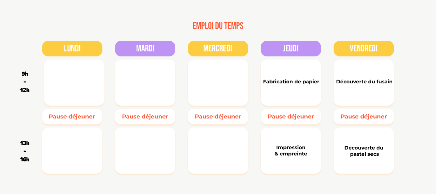 Dans l’espace d’atelier, les stagiaires libèrent leur imaginaire à travers des réalisations sur de multiples supports et à l’aide de divers techniques (fabrication de papier, fusain, pastel, …).