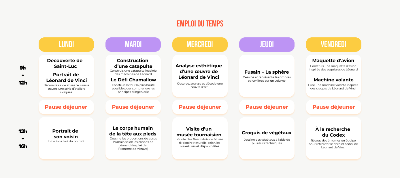 Découvre pendant une semaine les œuvres du célèbre Léonard De Vinci et les plus grands mystères de ce génie grâce à des enquêtes passionnantes autour d’ateliers créatifs retraçant la vie et le travail de cet artiste.